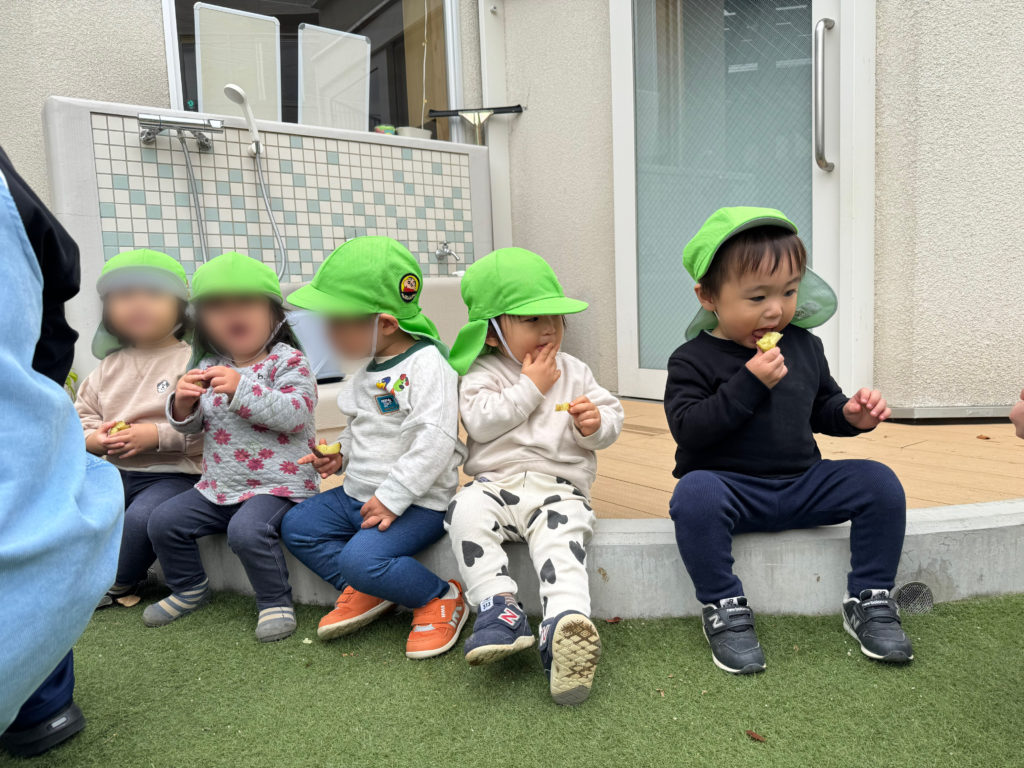 あひる・こばと組(2歳児)は午前のおやつがわりに焼き芋をパクリ!