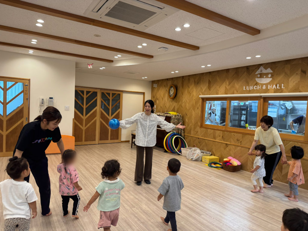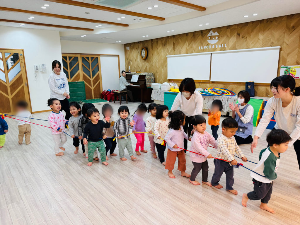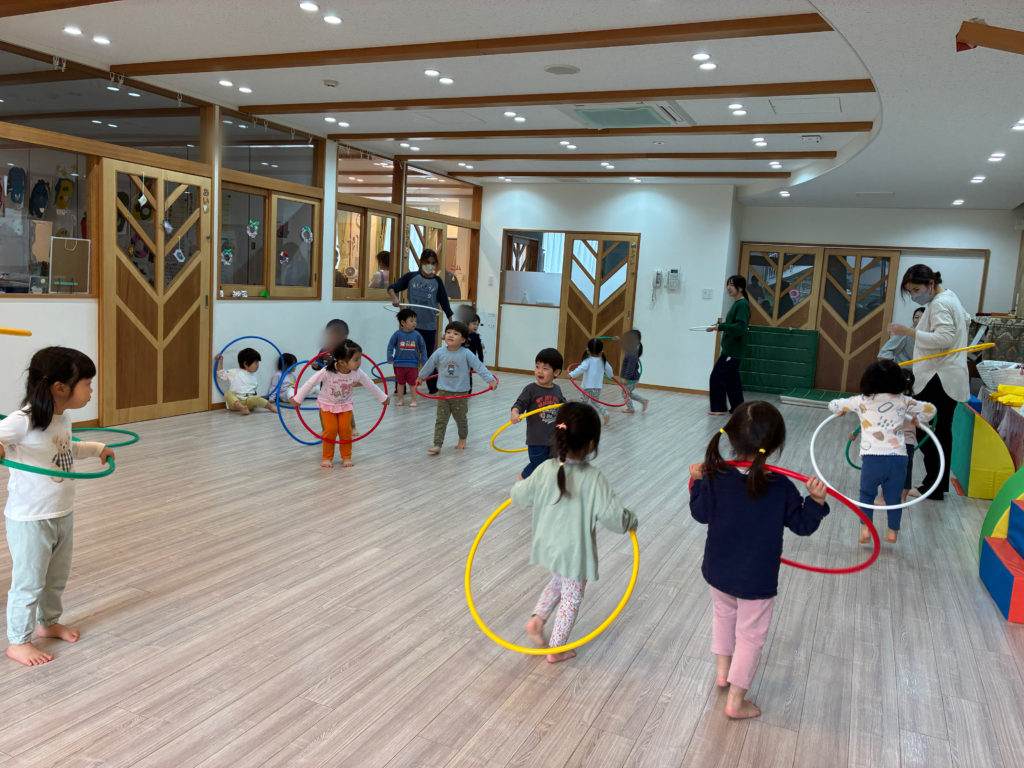 リトミック講師の田中鈴枝さんをお招きし、あひる・こばと組(1,2歳児)が音楽に合わせて体を動かして遊びました!