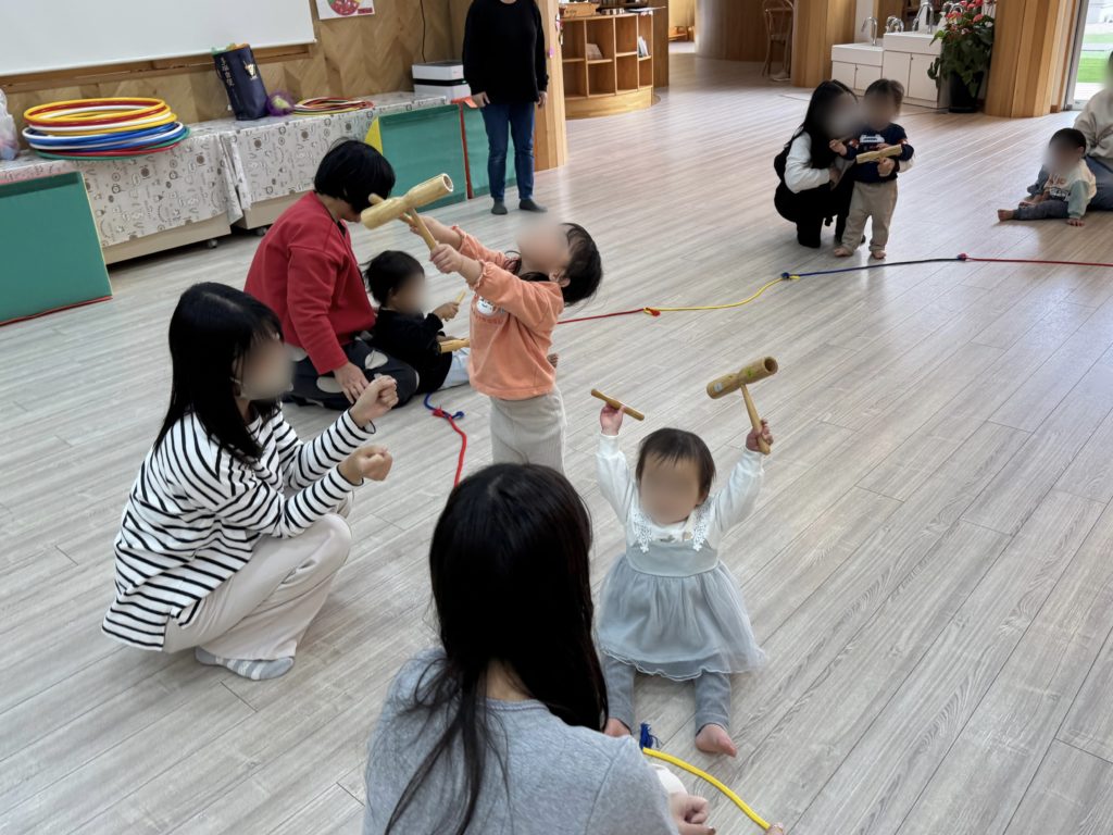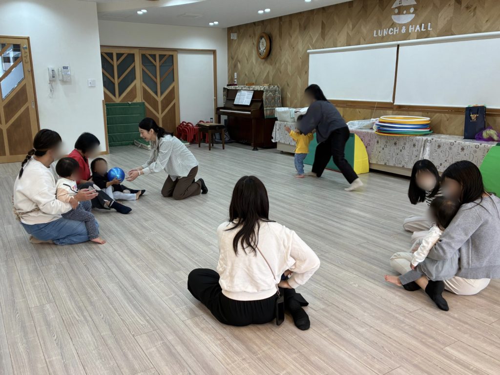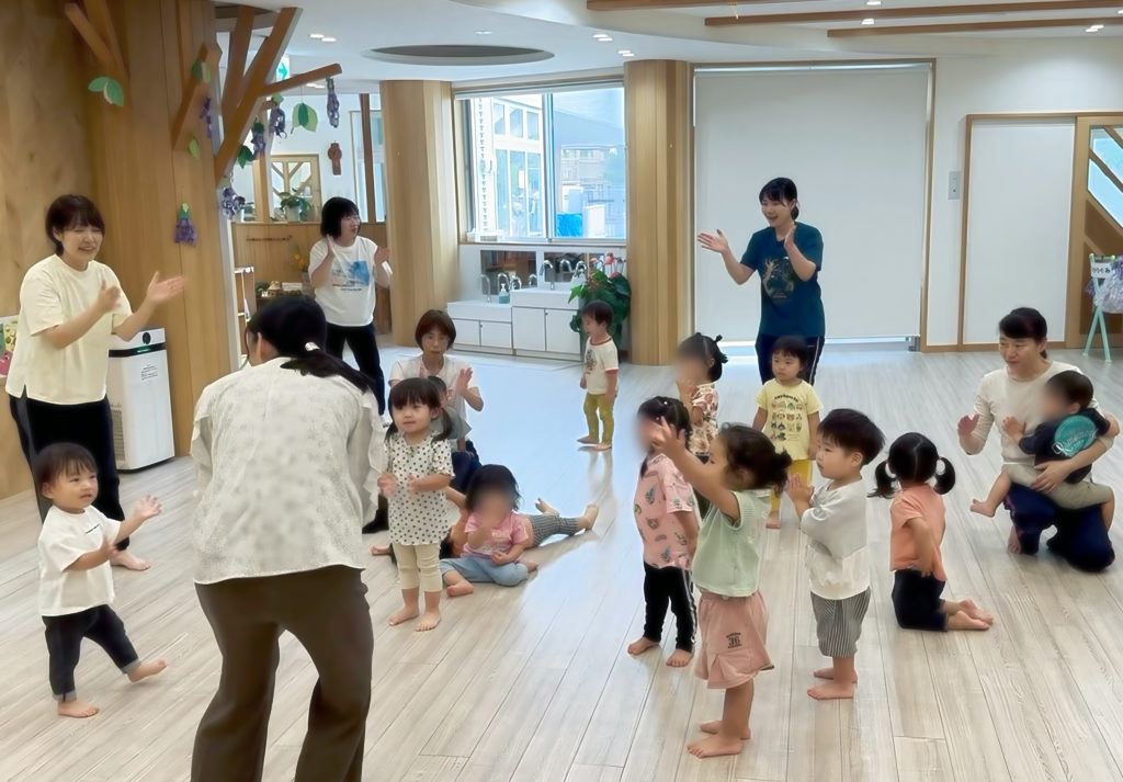 みんなが大好きな「どんぐりころちゃん」が始まると大喜び! 一緒に手遊びを楽しみました。