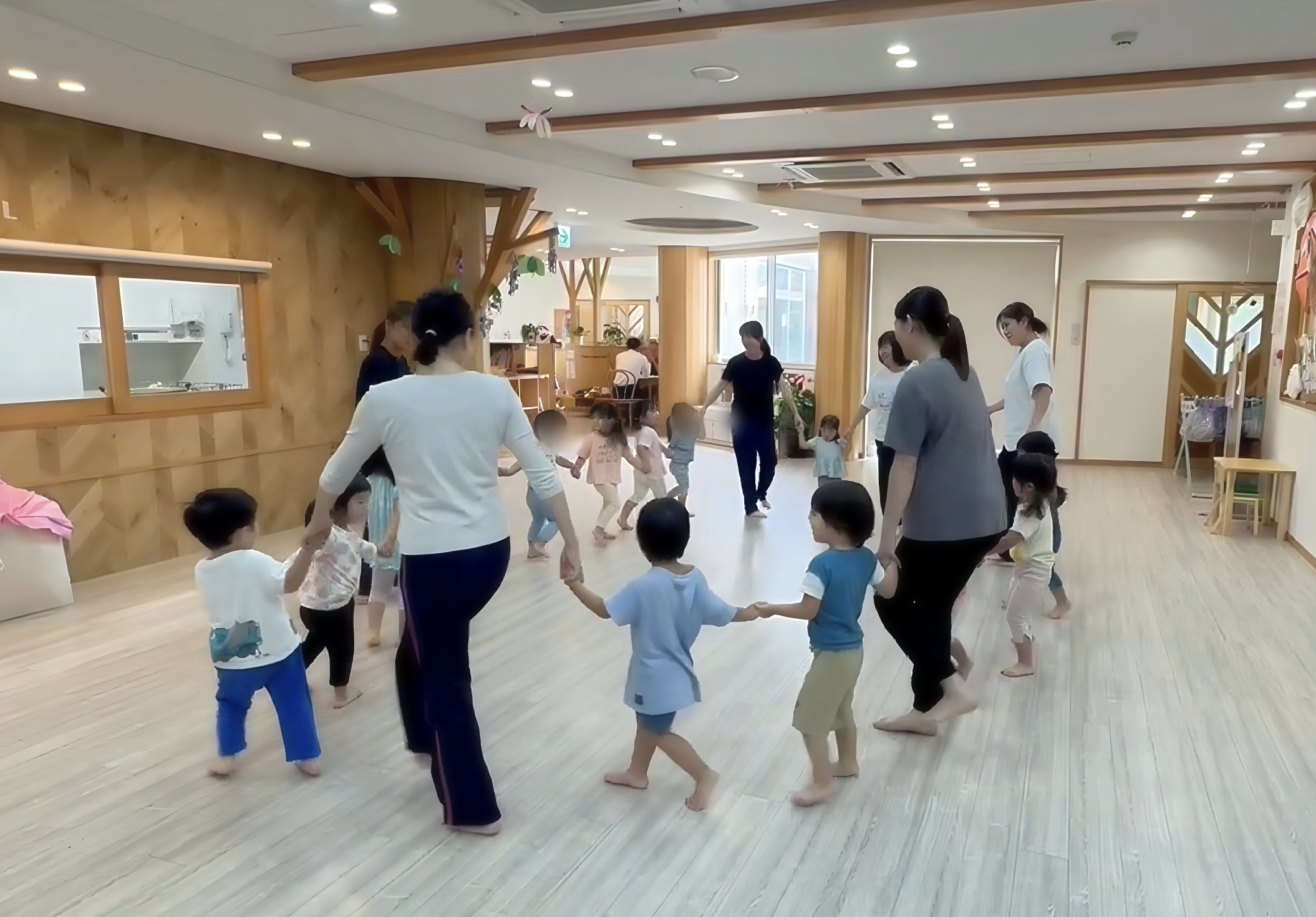 早速、手を繋いで丸くなり音楽に合わせて歩きました。「友だちと一緒で楽しいね!」