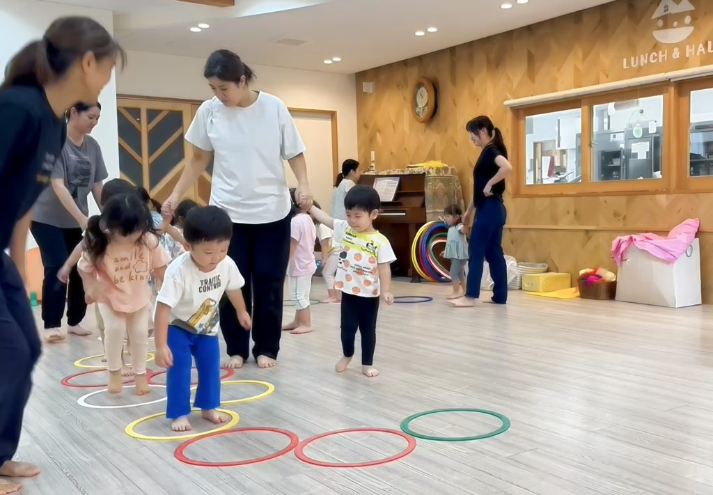初めは「何をやるんだろう?」とちょっぴり不安そうでしたが、ピアノの音が聞こえると担任と一緒に元気に体を動かし始めました!