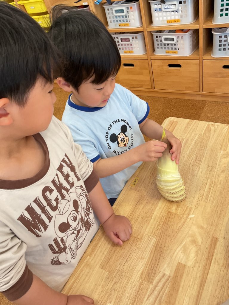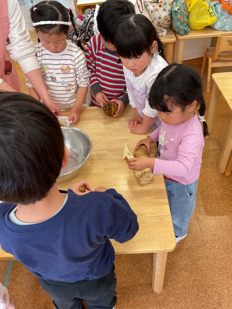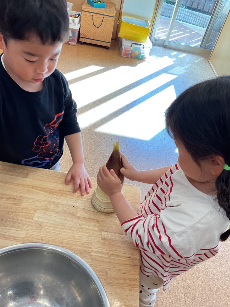 「お髭が生えてる」「固くて剥けなーい」など言いながら頑張って剥きました。